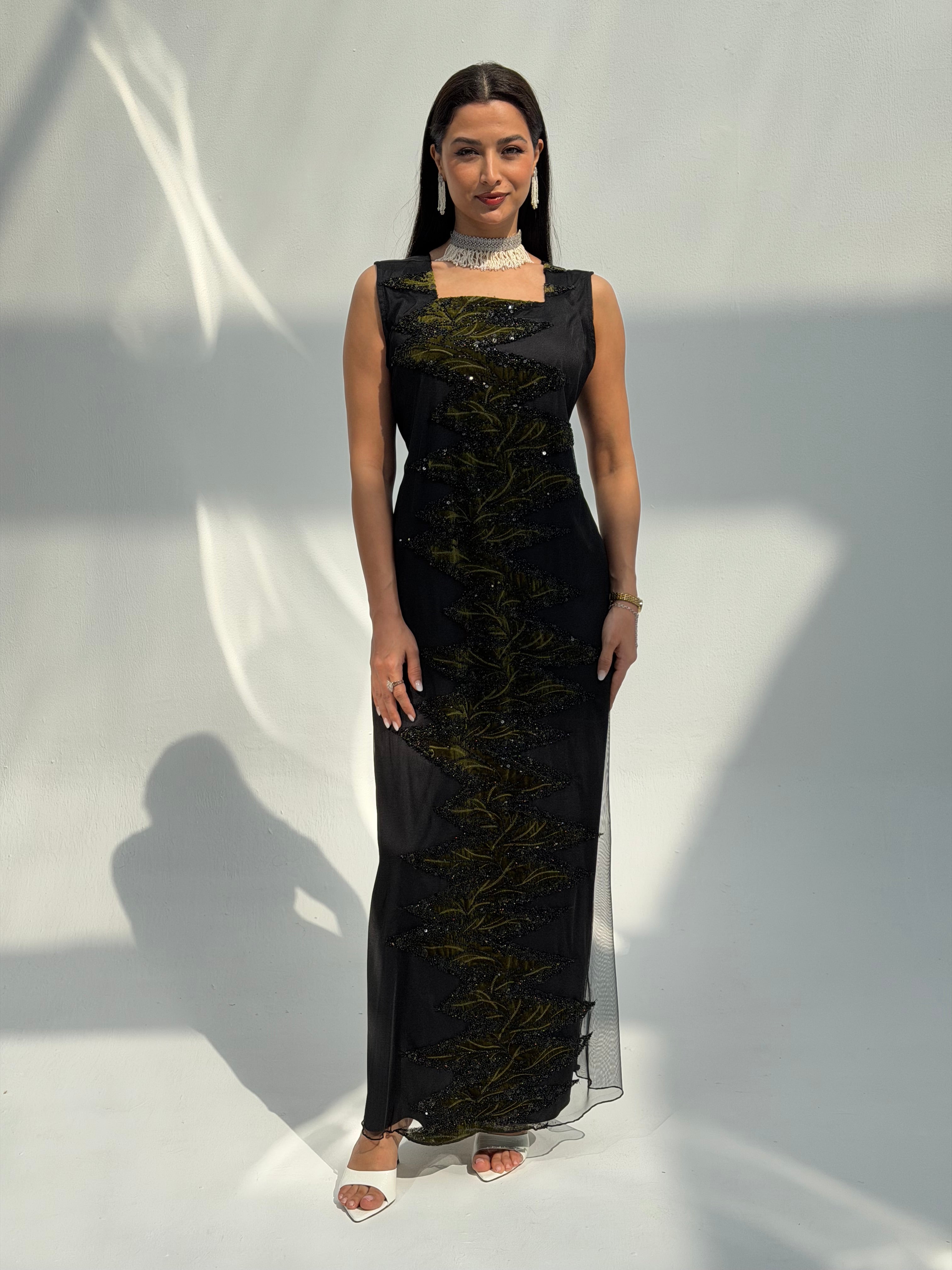 عباية رقيقة من التول، مزينة بتفاصيل مخملية مطرزة يدوياً بالخرز.