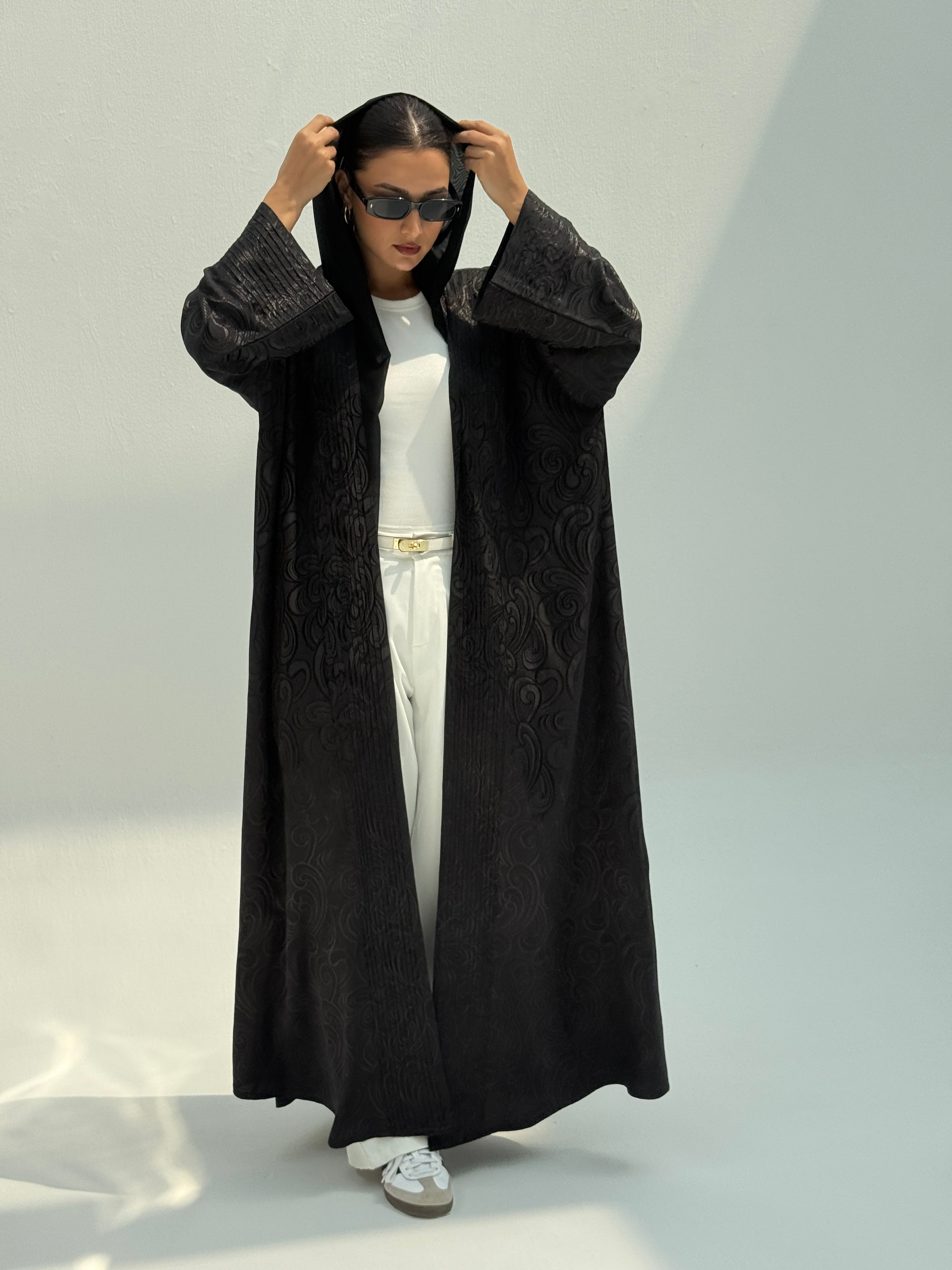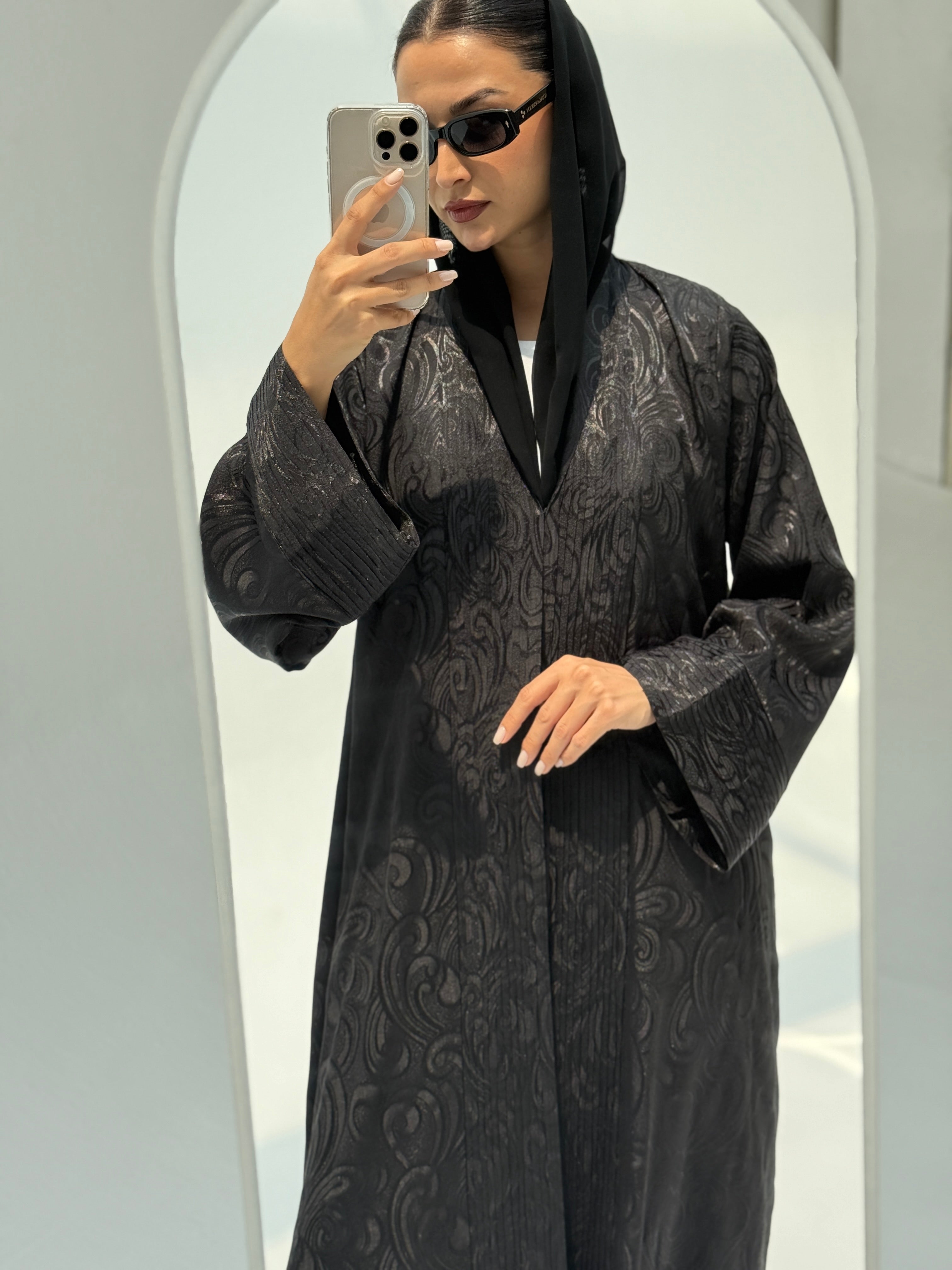 عباية أنيقة مصنوعة من قماش الجاكار مع أنماط منسوجة دقيقة تضيف لمسة راقية وخالدة.