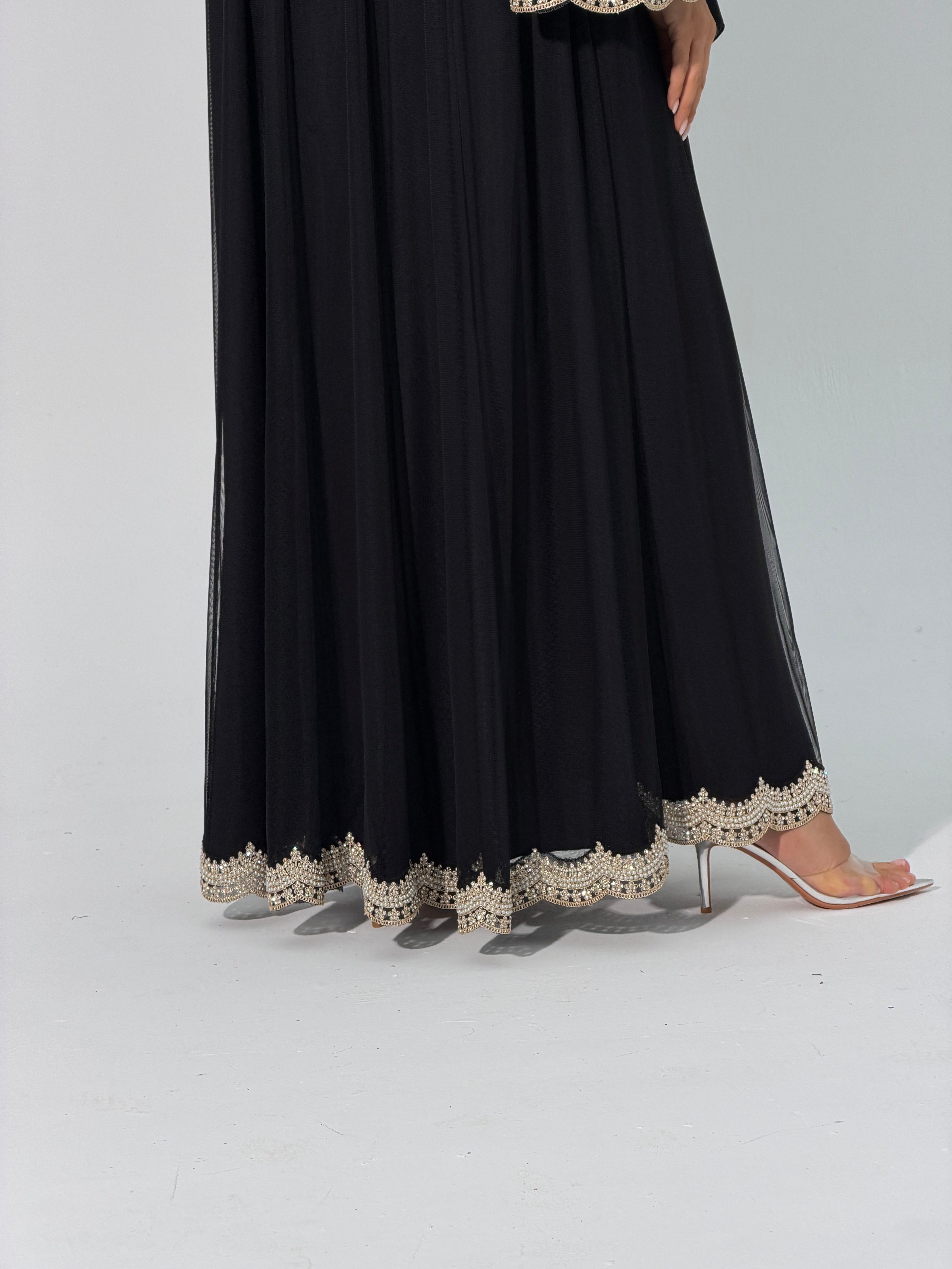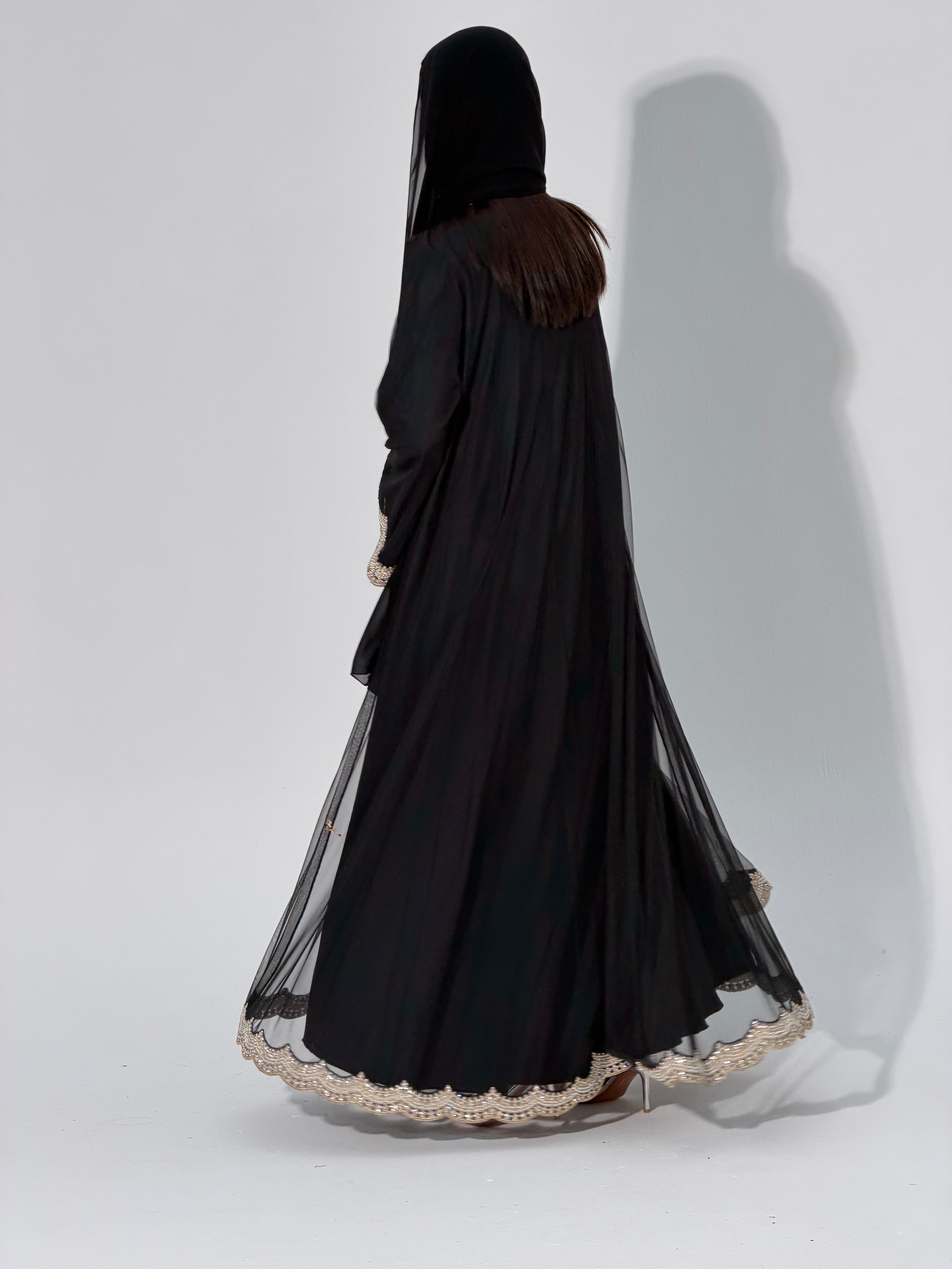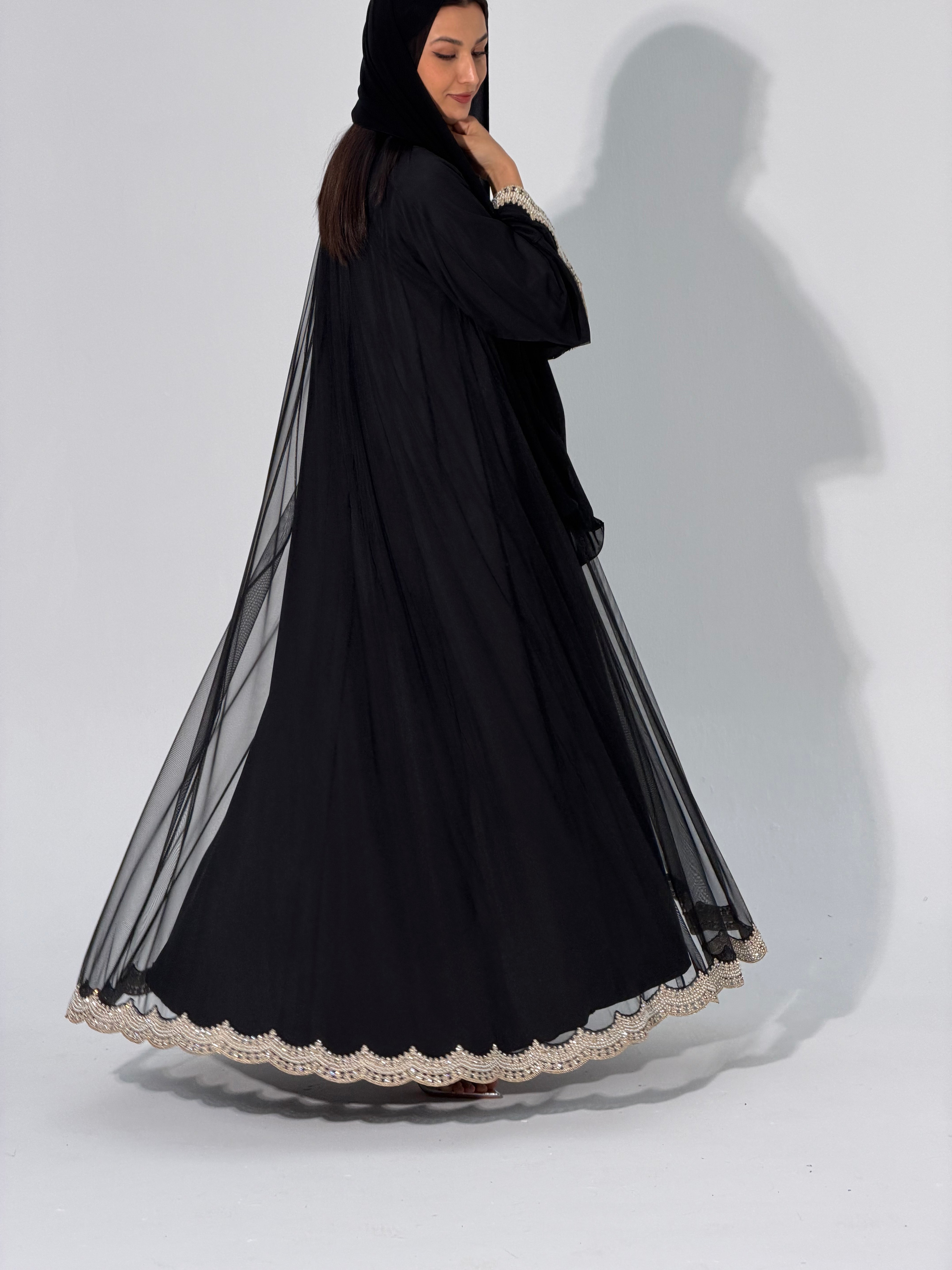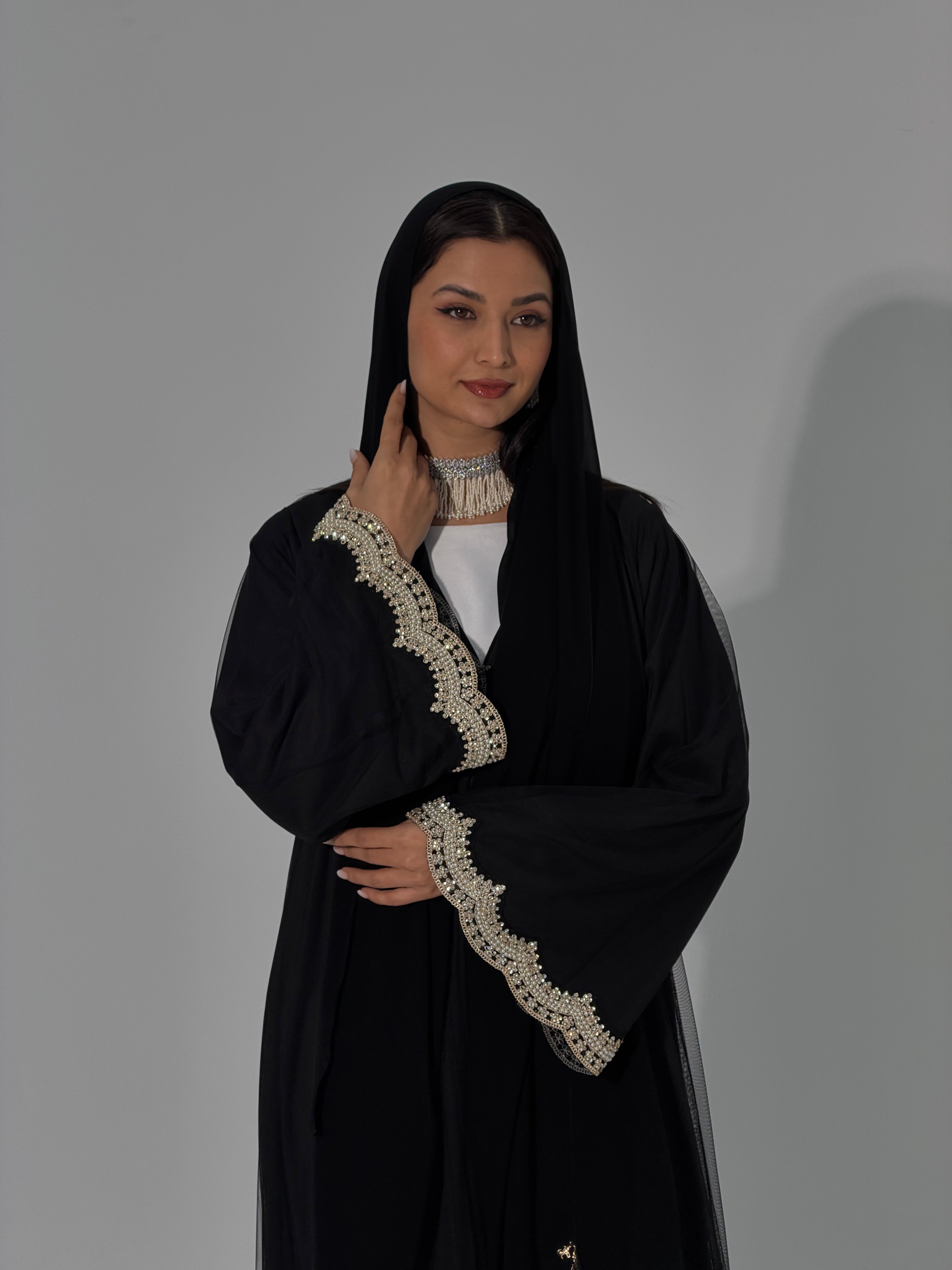 Step into a world of sophistication with the Zari Abaya, a stunning blend of tradition and modernity. Crafted from sheer tulle, this exquisite piece features delicate embroidered lines adorned with lustrous pearl detailing. Whether you choose the fully sheer option for a light, ethereal look or opt for the lined version for added comfort, the Zari Abaya is designed to make you feel confident and graceful on any occasion.