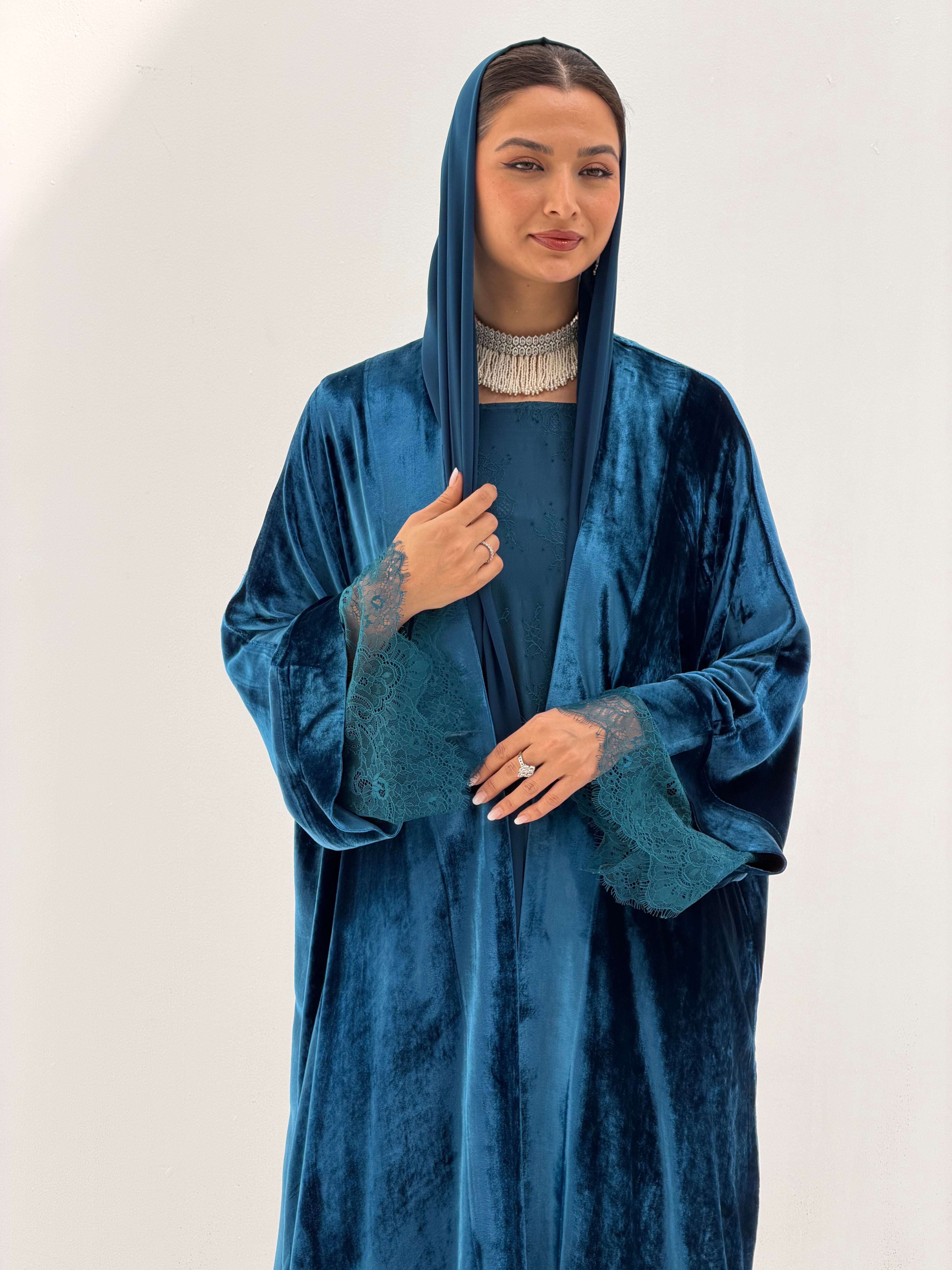 Romance: Luxurious Bisht Velvet Abaya with Inner Dantil Dress & Sheila