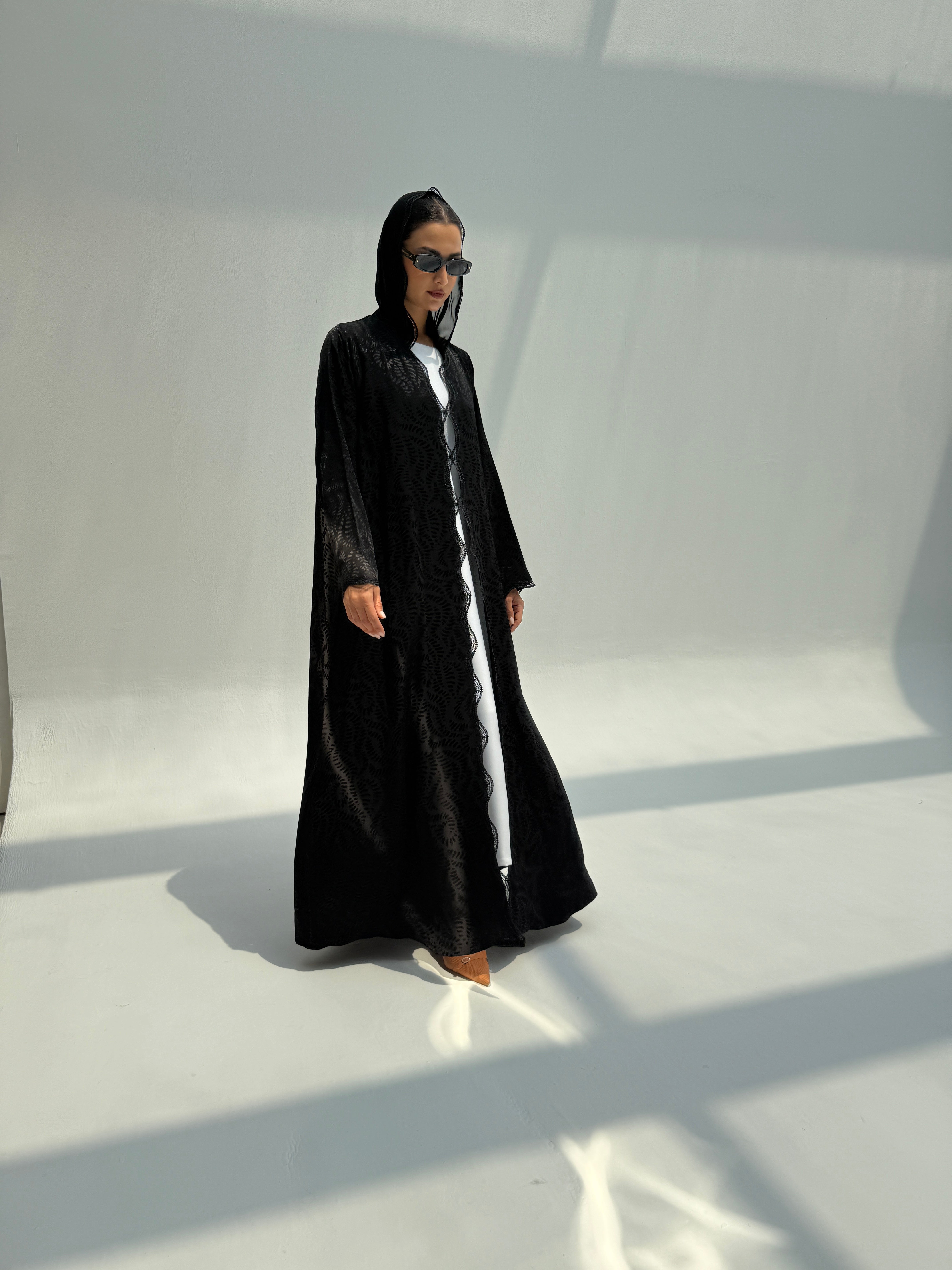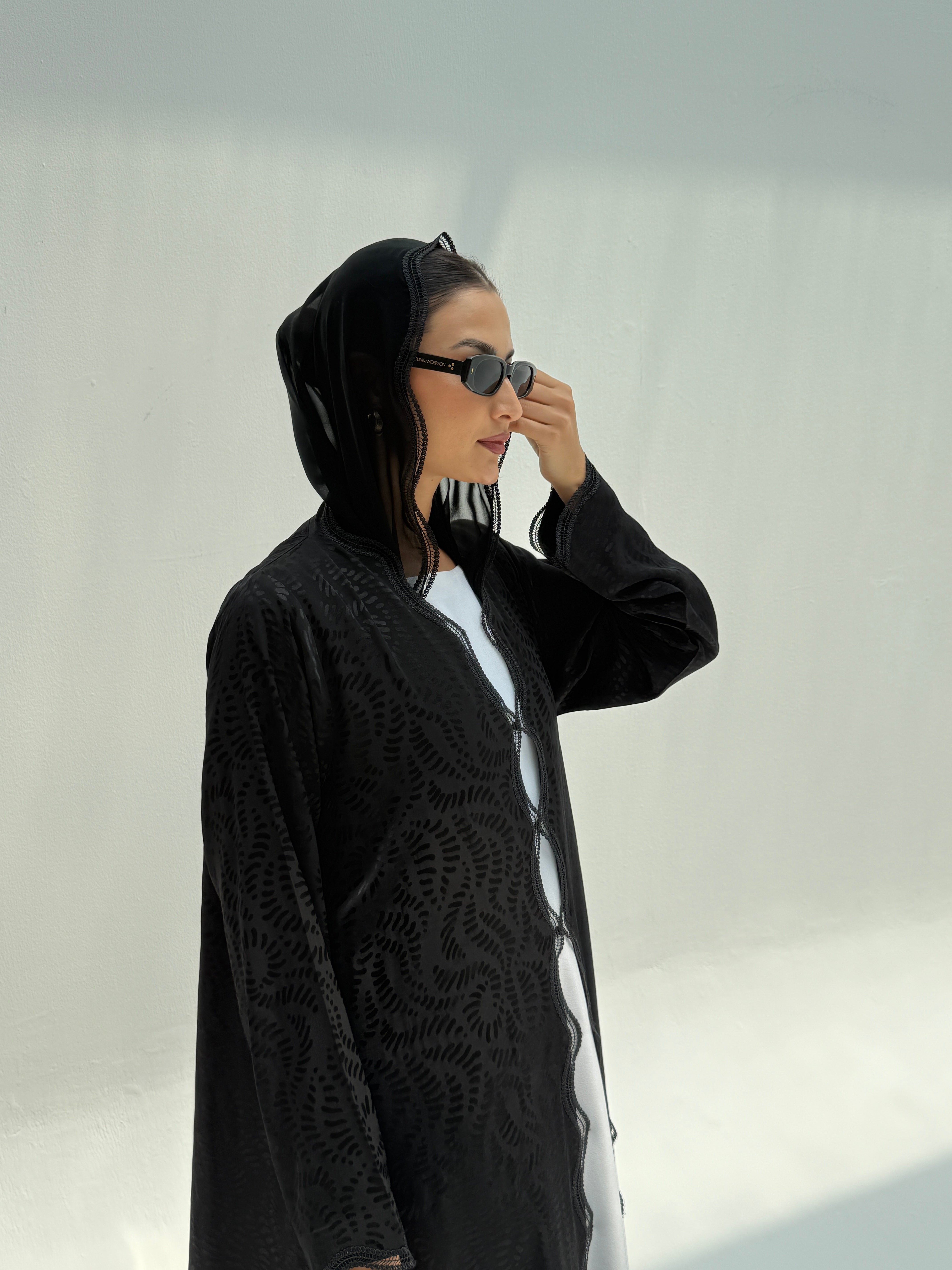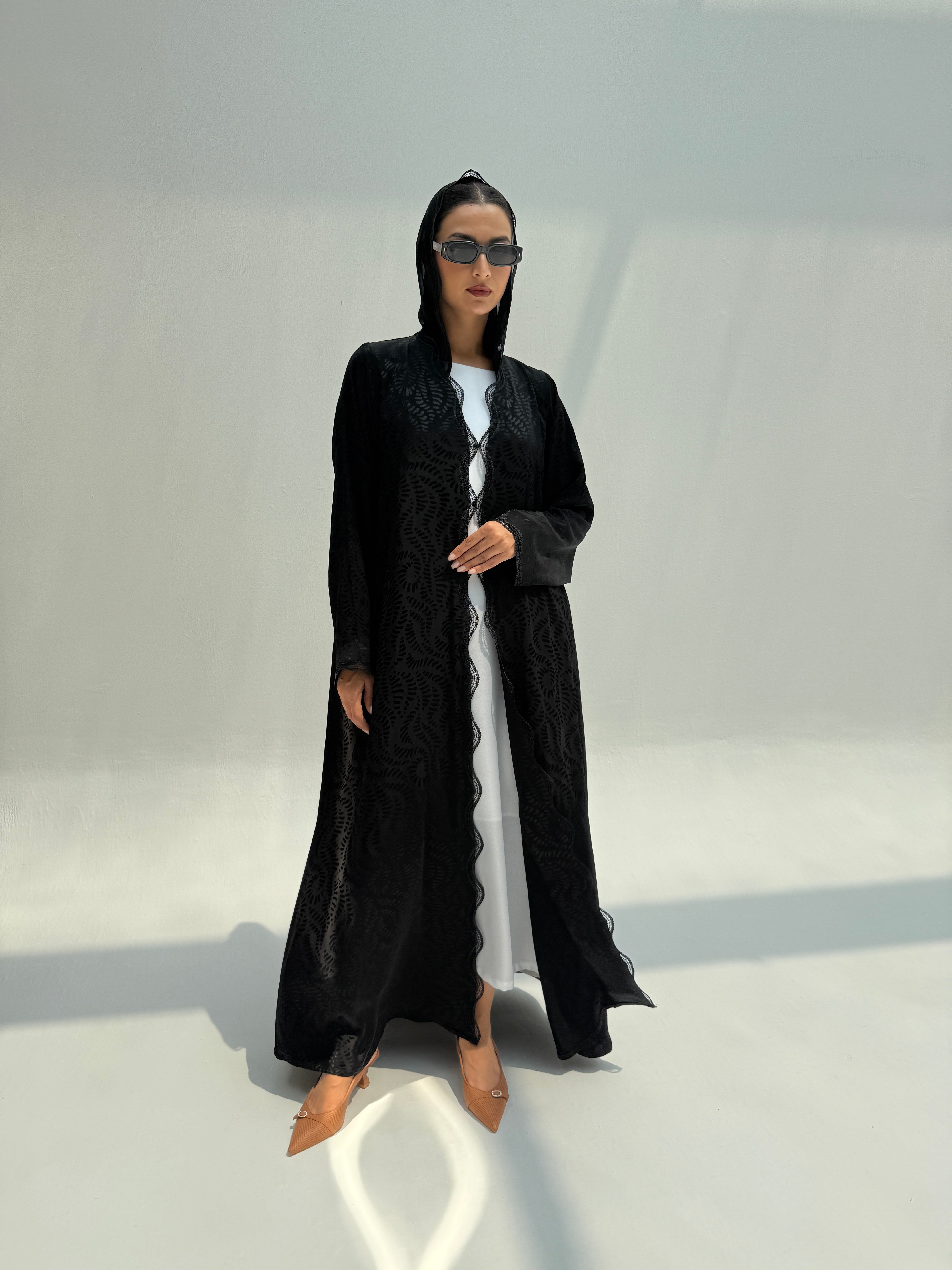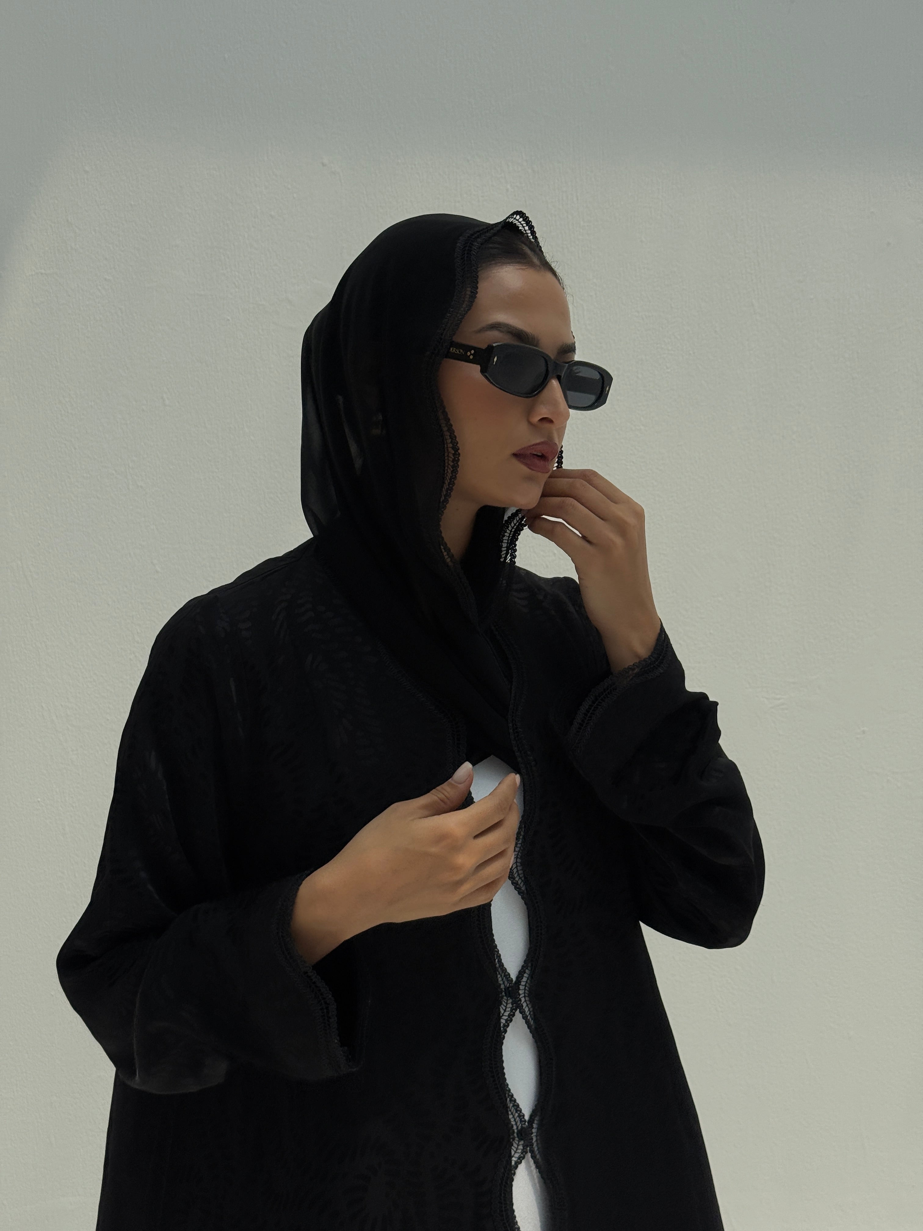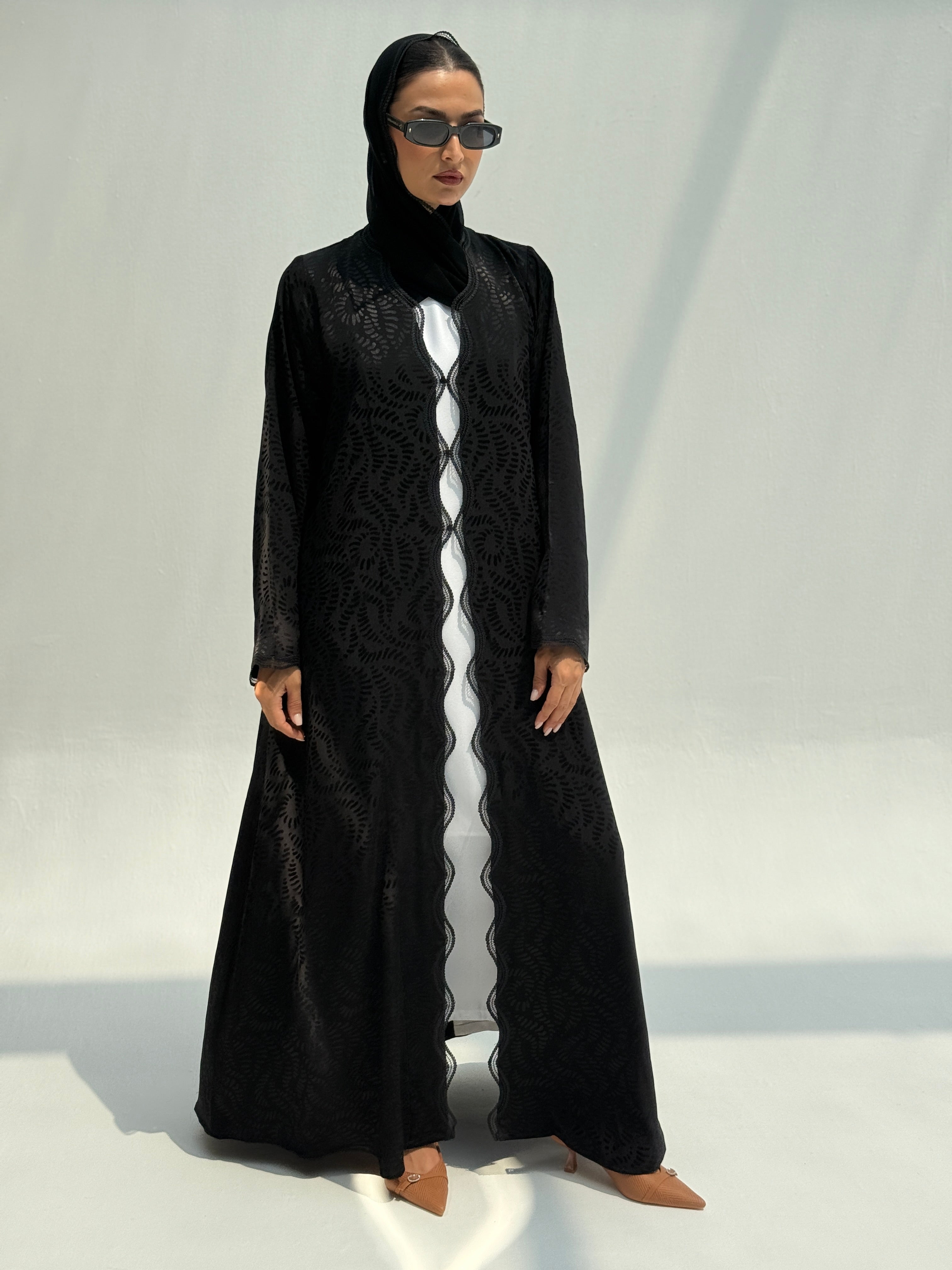 Elegant black abaya crafted from premium Turkish jacquard fabric, delicately finished with lace-trimmed edges for a refined and timeless look.