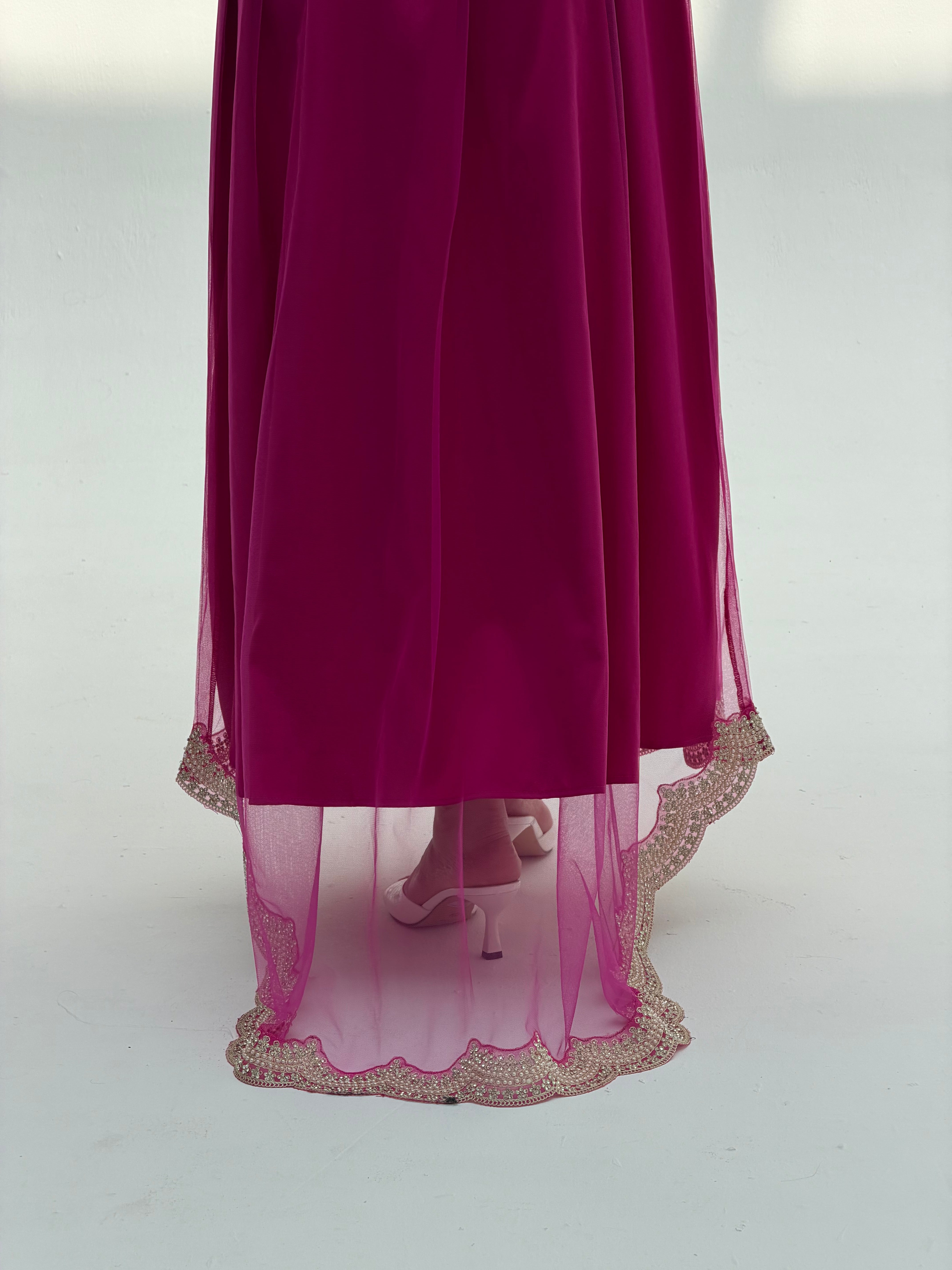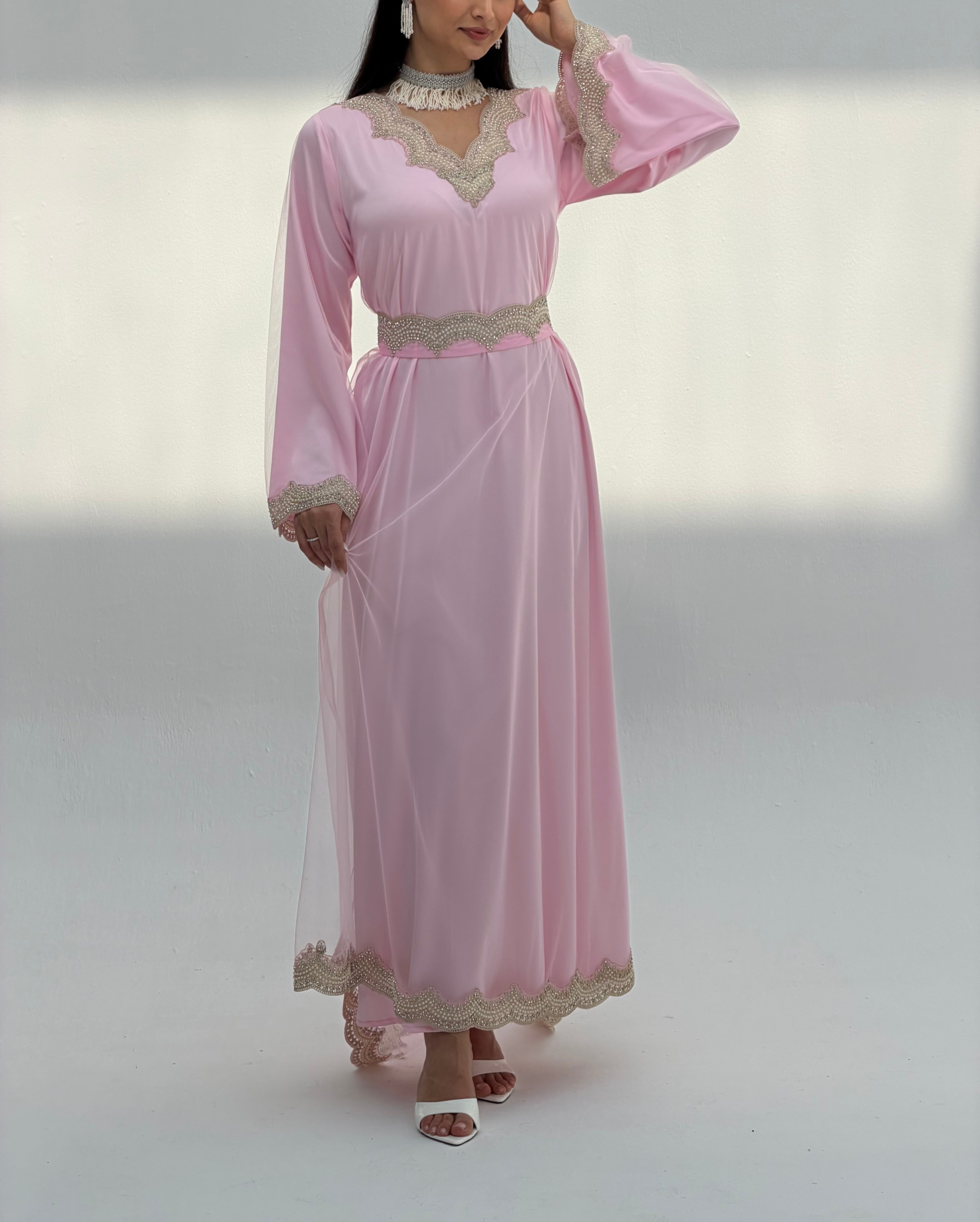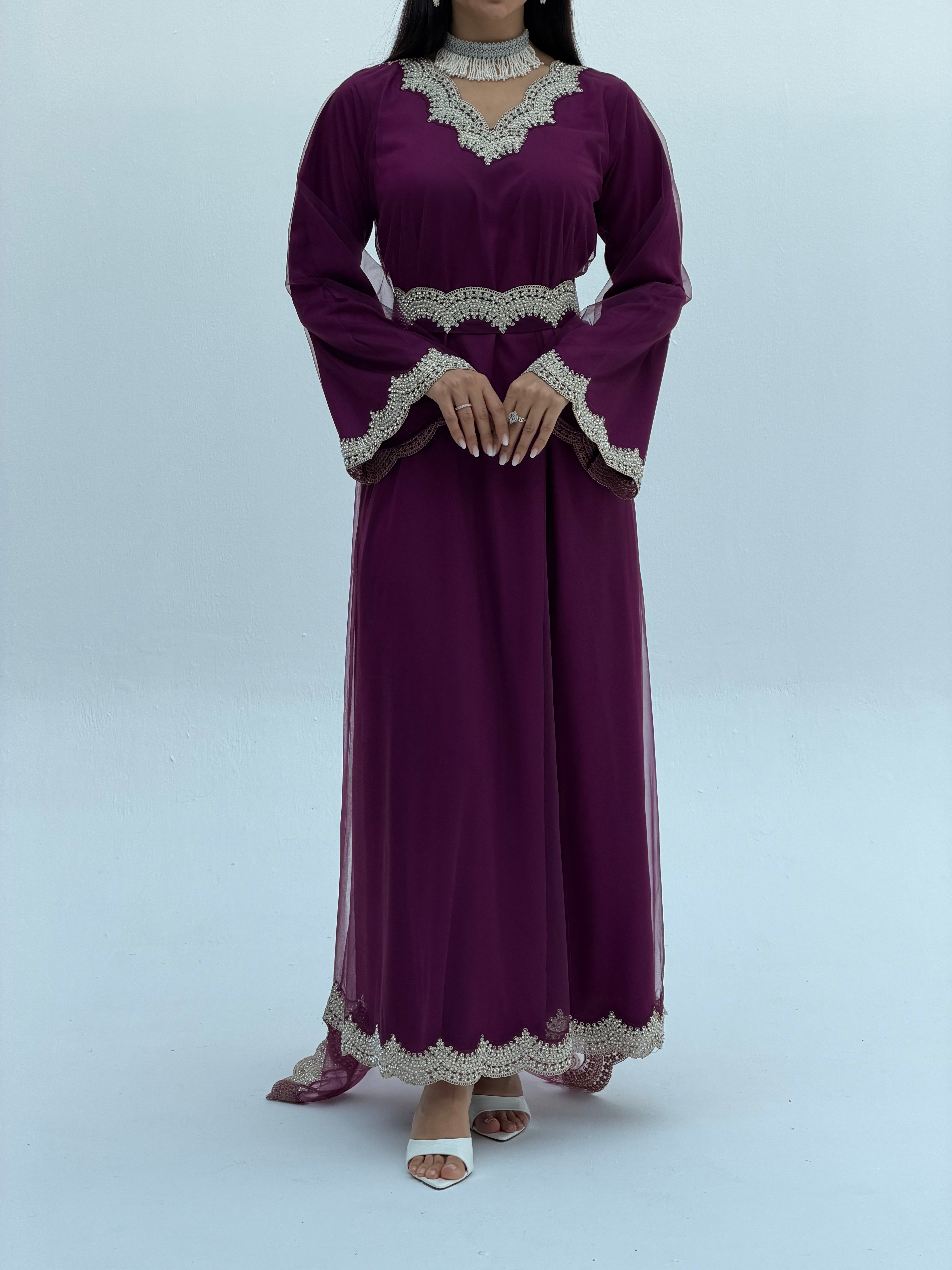 A delicate lace dress adorned with crystal and zari embroidery along the edges, crafted to create an elegant and refined look.