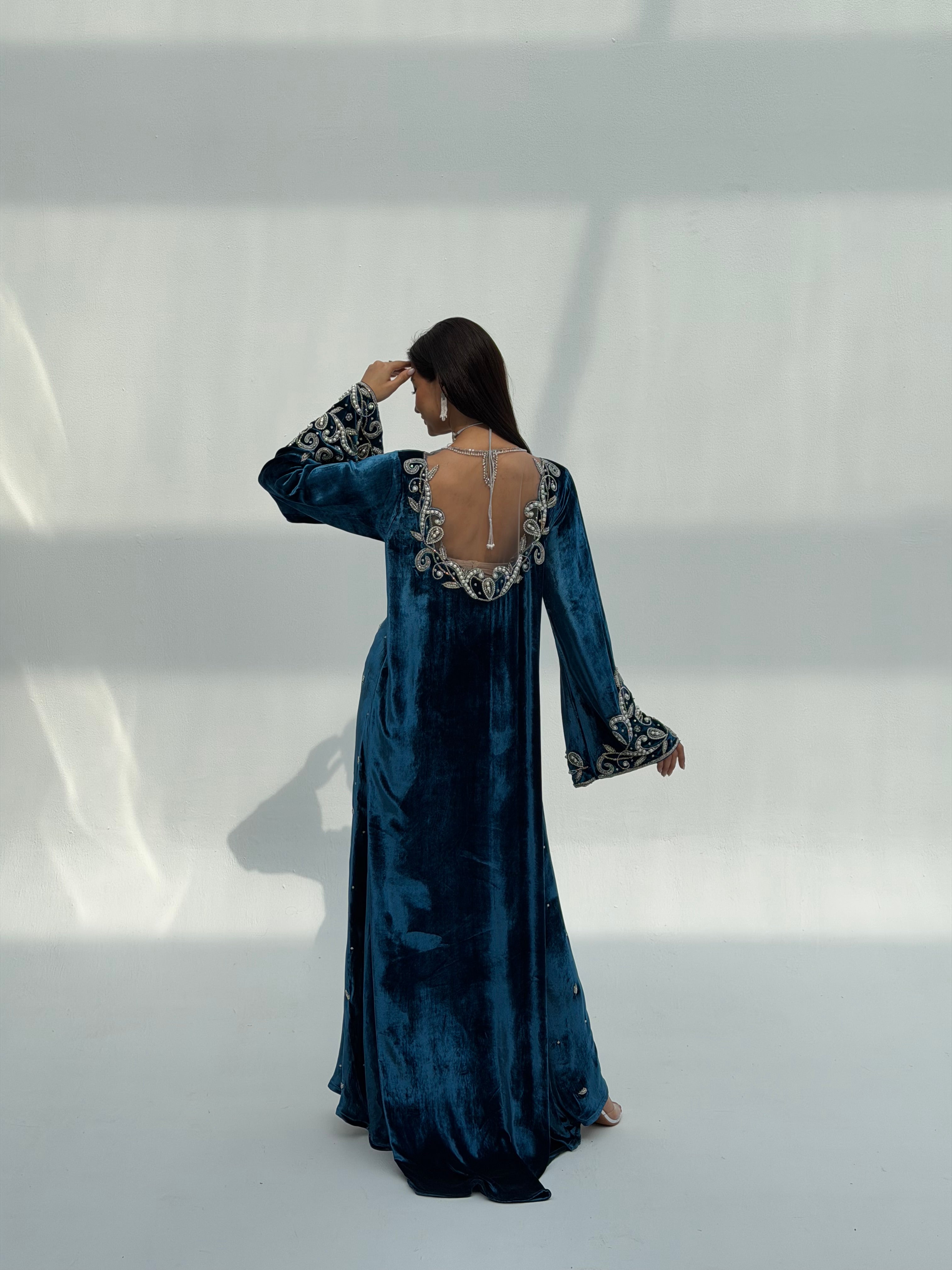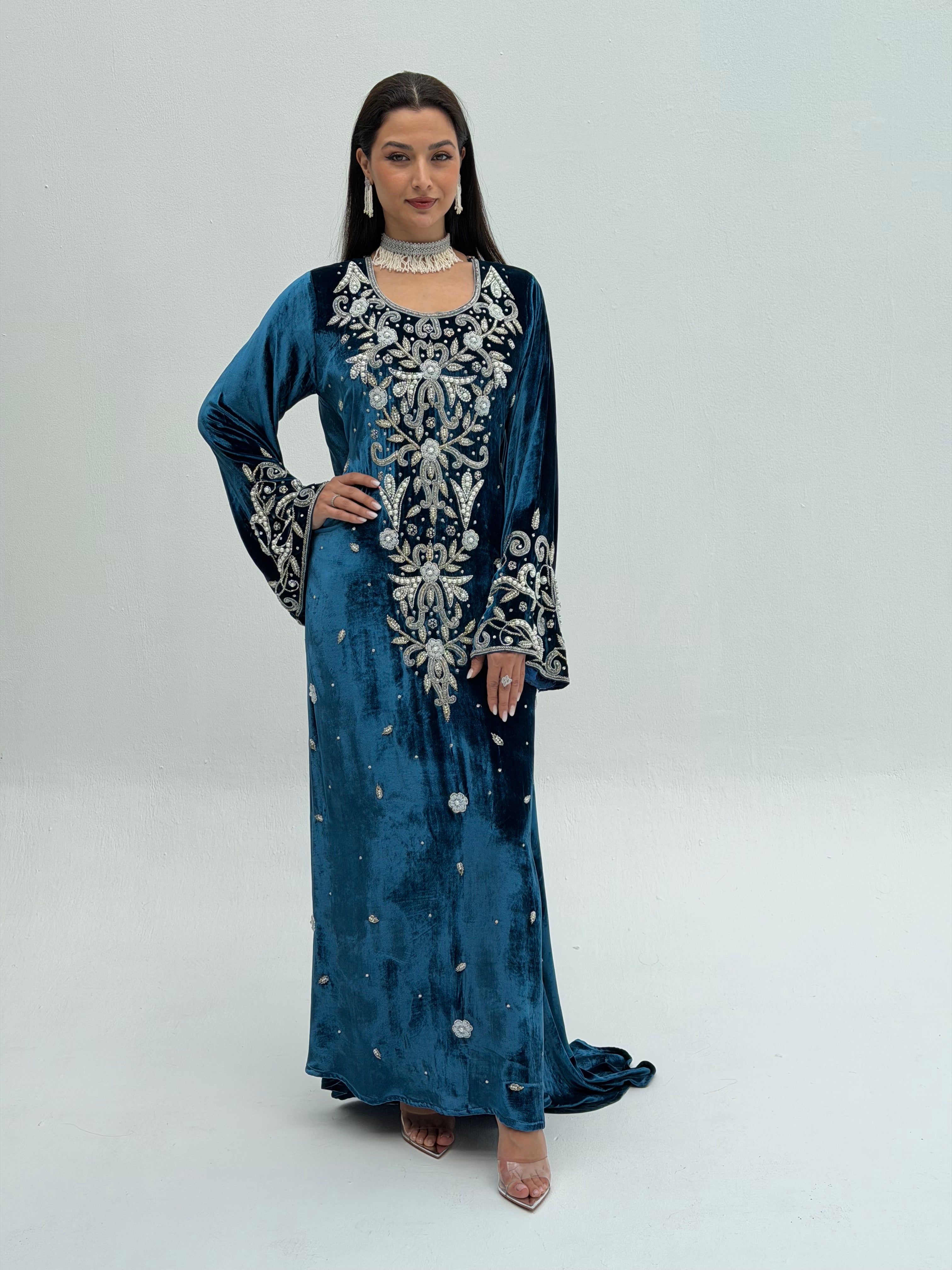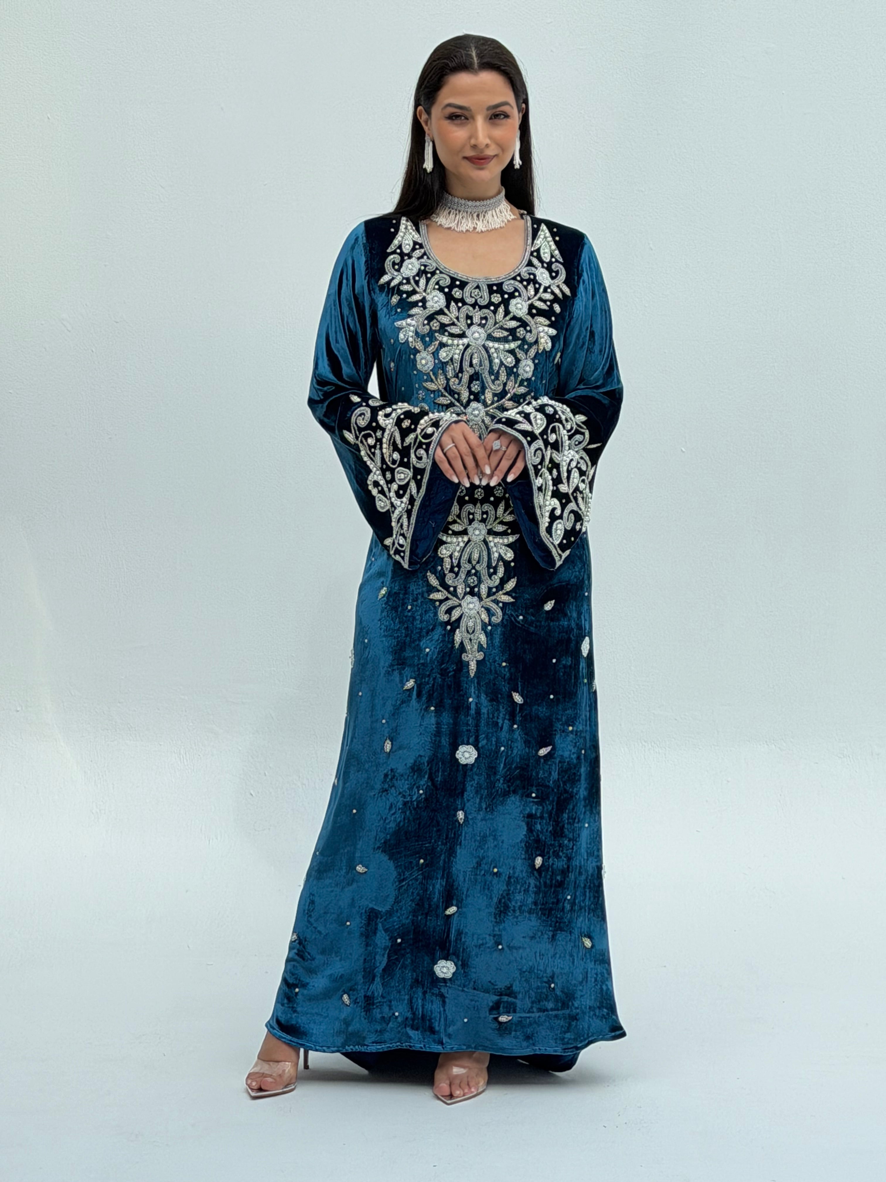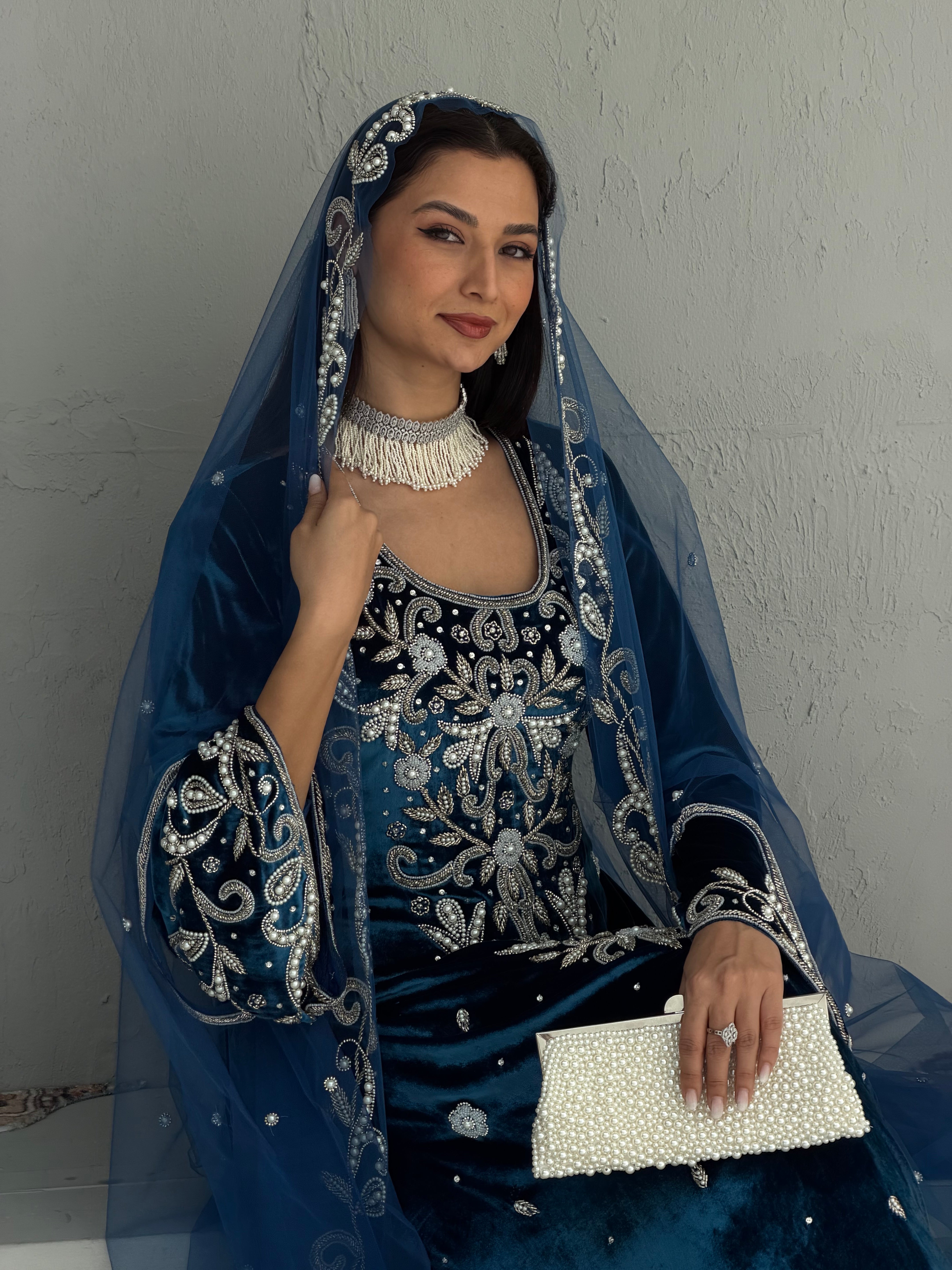 Luxury velvet chiffon dress, exquisitely handcrafted with hand-embroidered pearls and crystals, reflecting elegance and refined artistry.