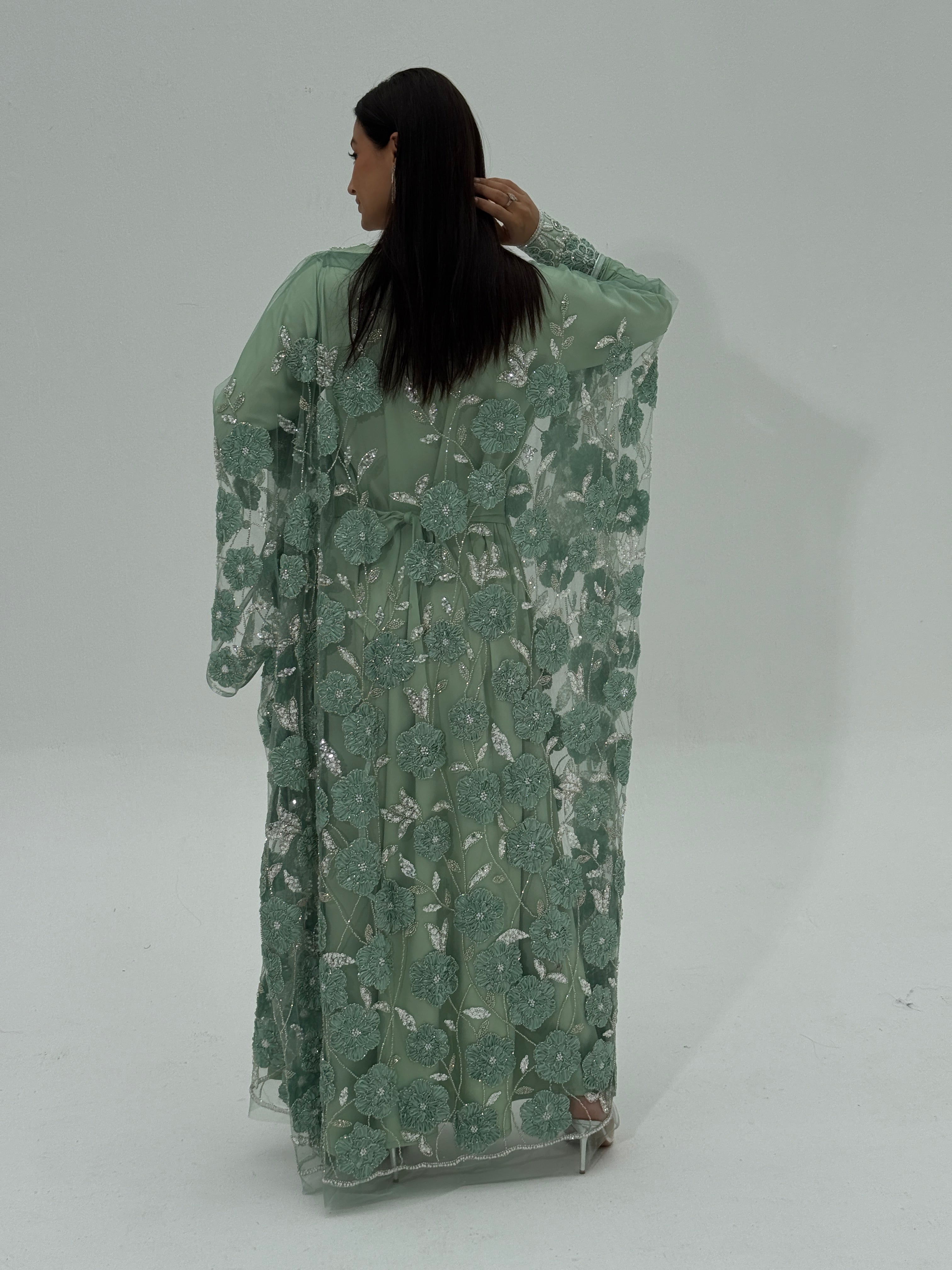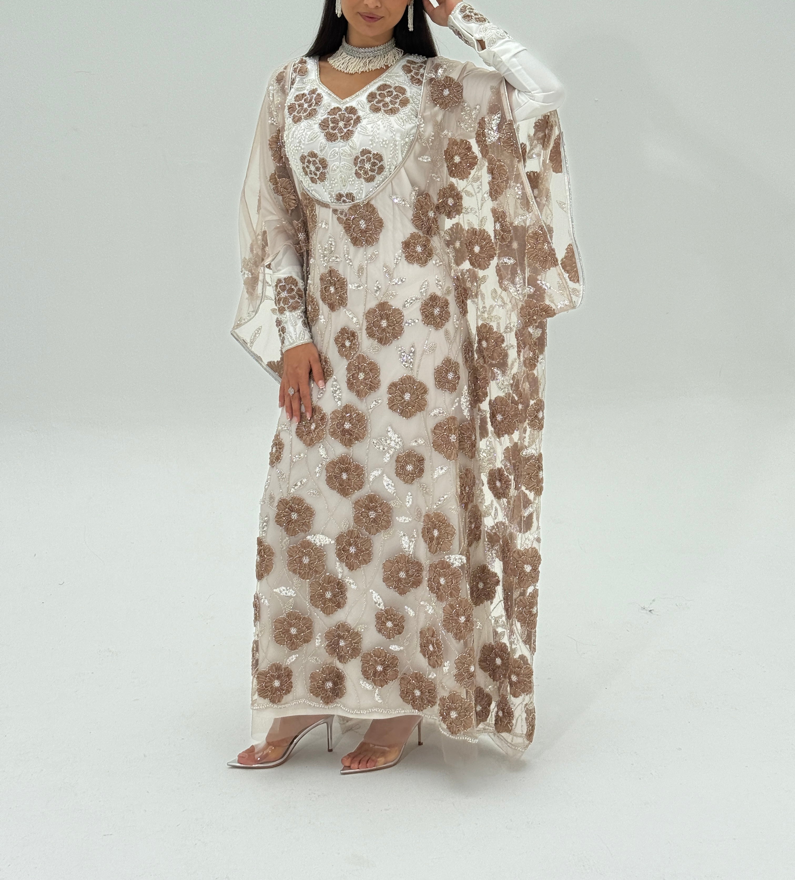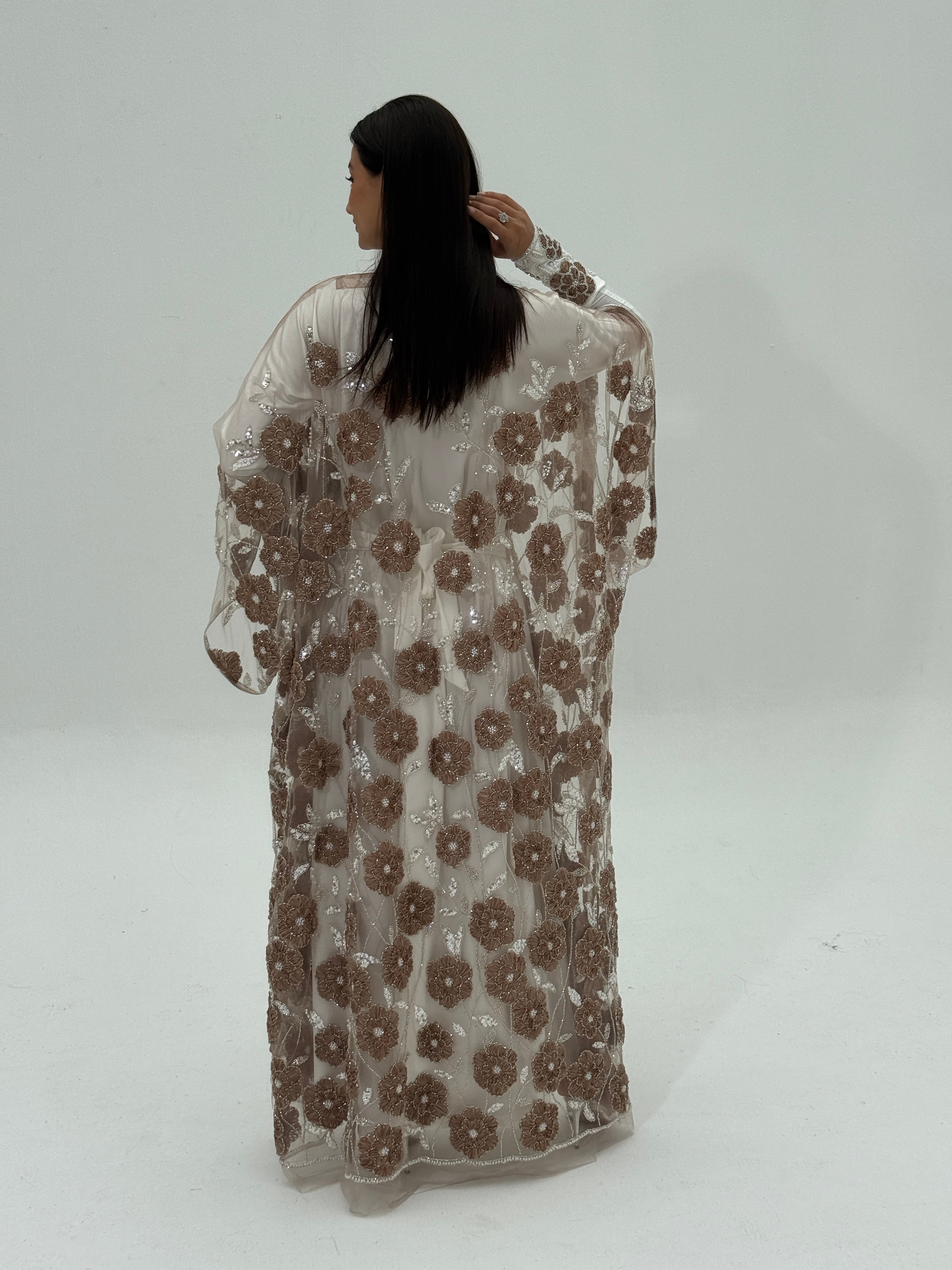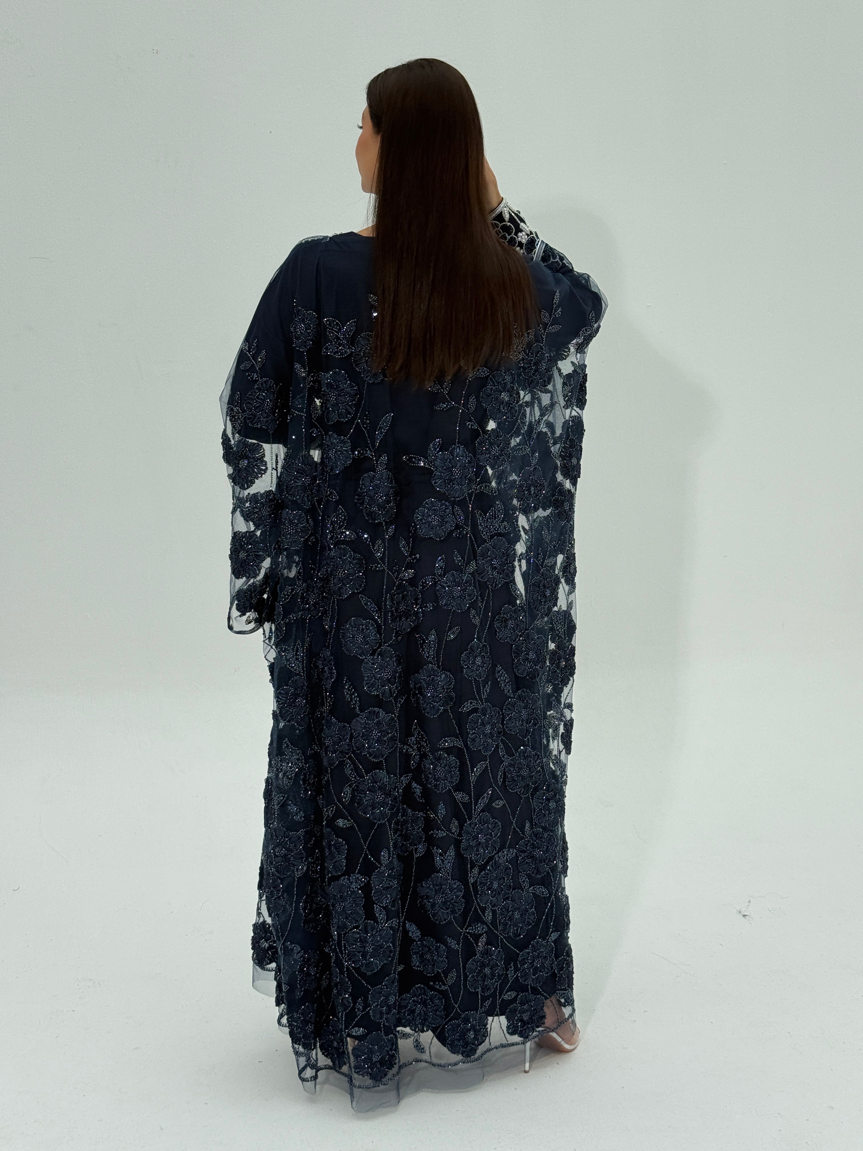 An elegant Emirati thobe crafted from fully embellished tulle fabric, intricately detailed with beadwork and delicate ribbon accents. The neckline and sleeves are carefully handworked, adding a refined and luxurious touch to the design.
