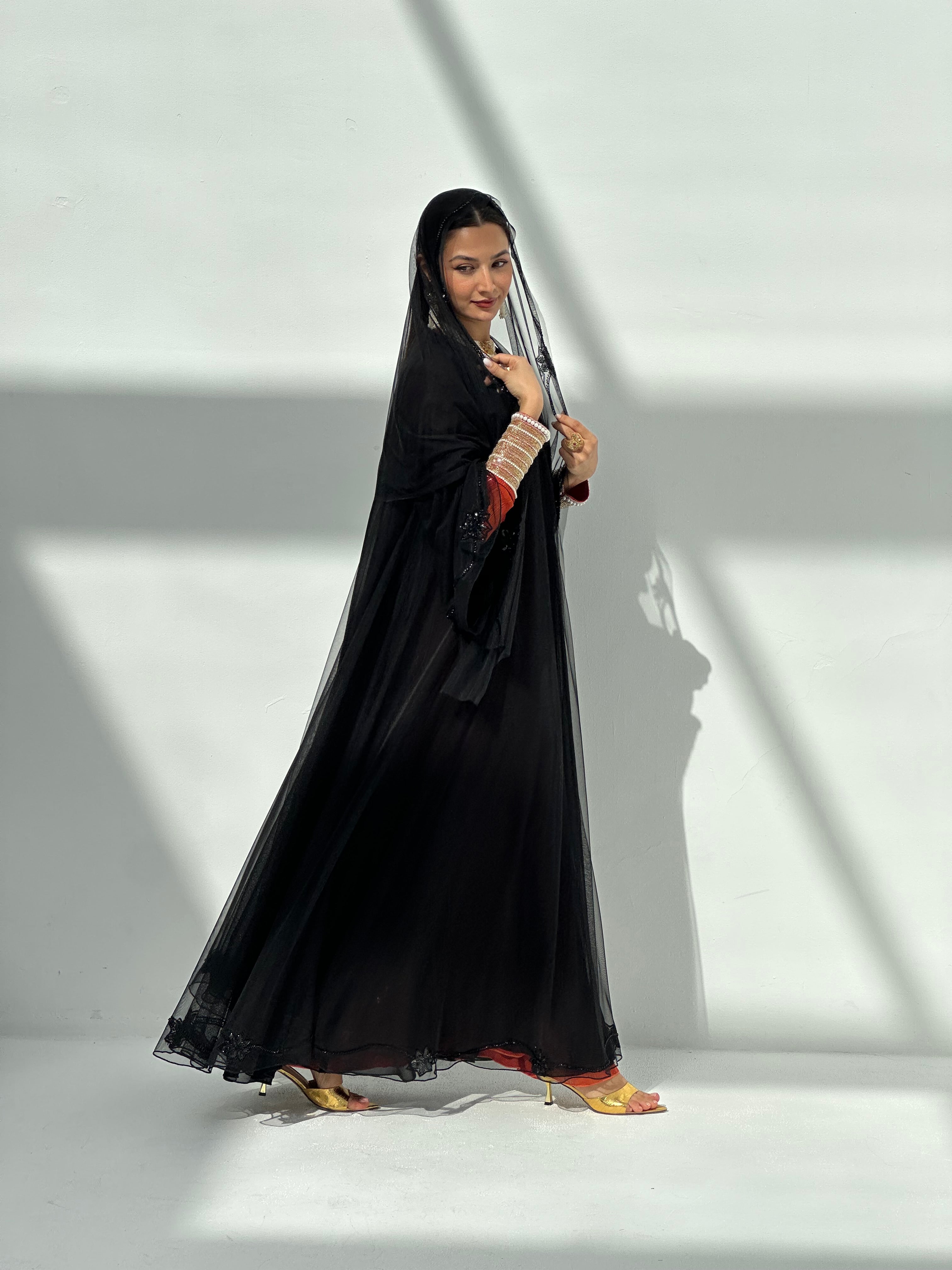 Crafted from lightweight tuse & chiffon, this elegant abaya features delicately laced edges for a refined and modern finish. Designed with a graceful flow, it comes complete with sheila for a perfectly coordinated look.